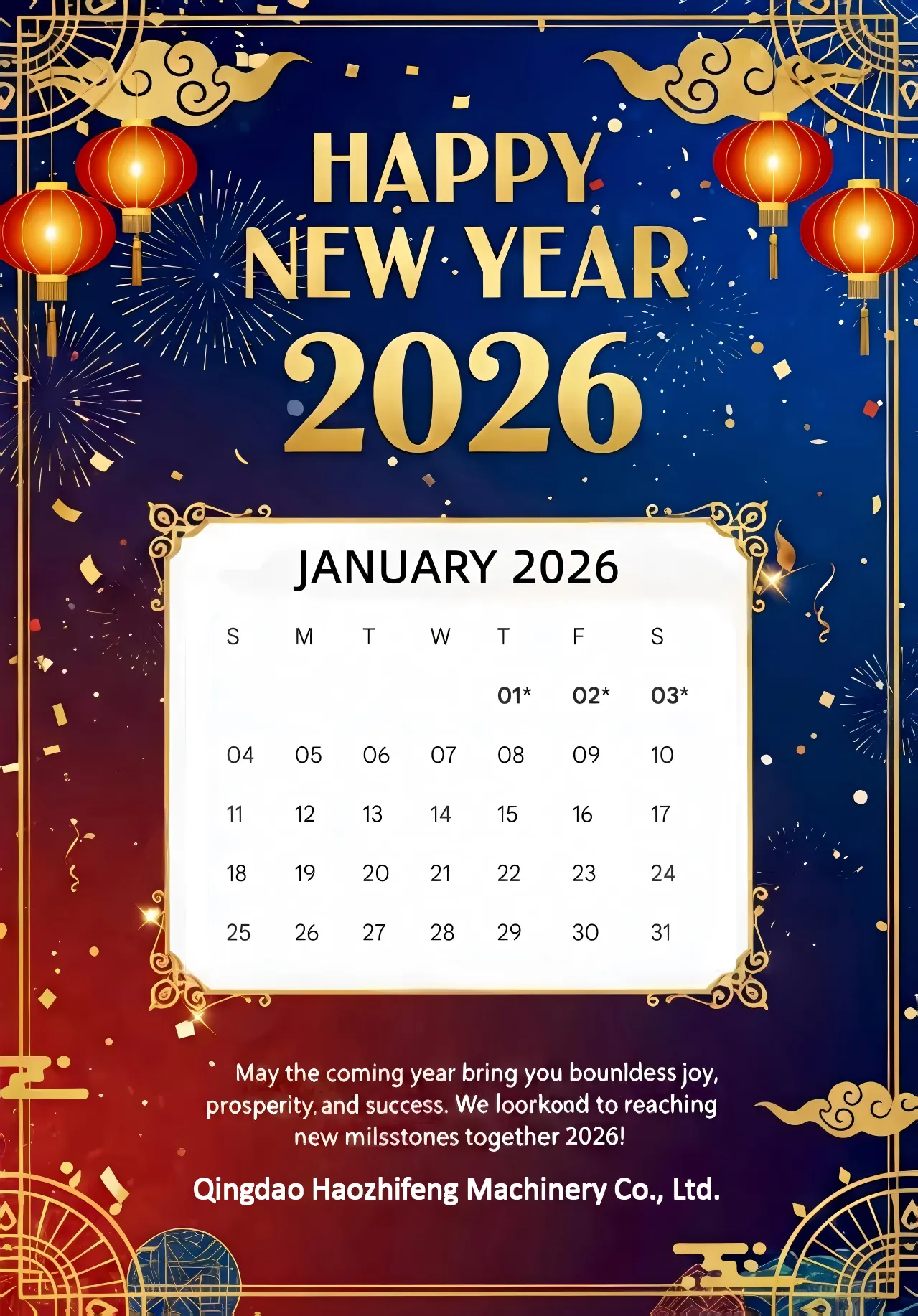 Que o Ano Novo de 2026 lhe traga alegria, sucesso e toda boa sorte! Esperamos continuar a trabalhar com vocês de mãos dadas no novo ano e criar conquistas mais brilhantes juntos.